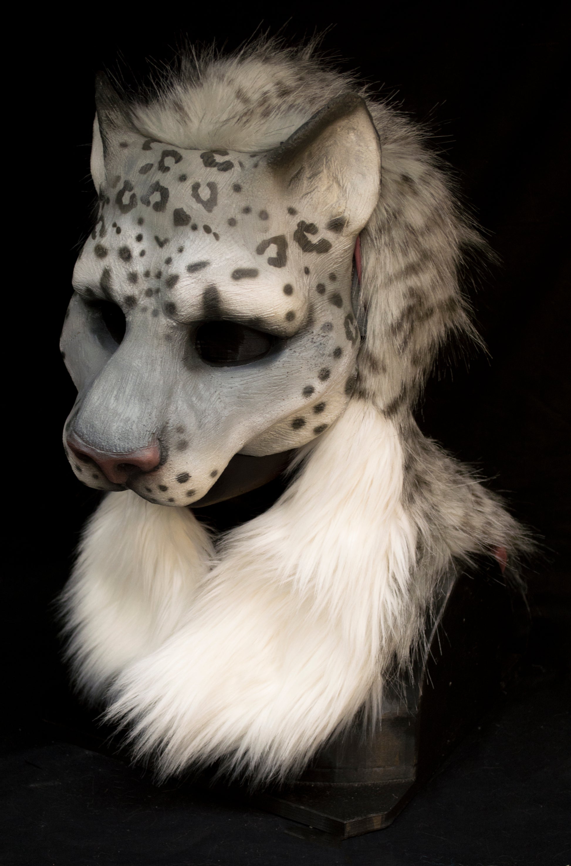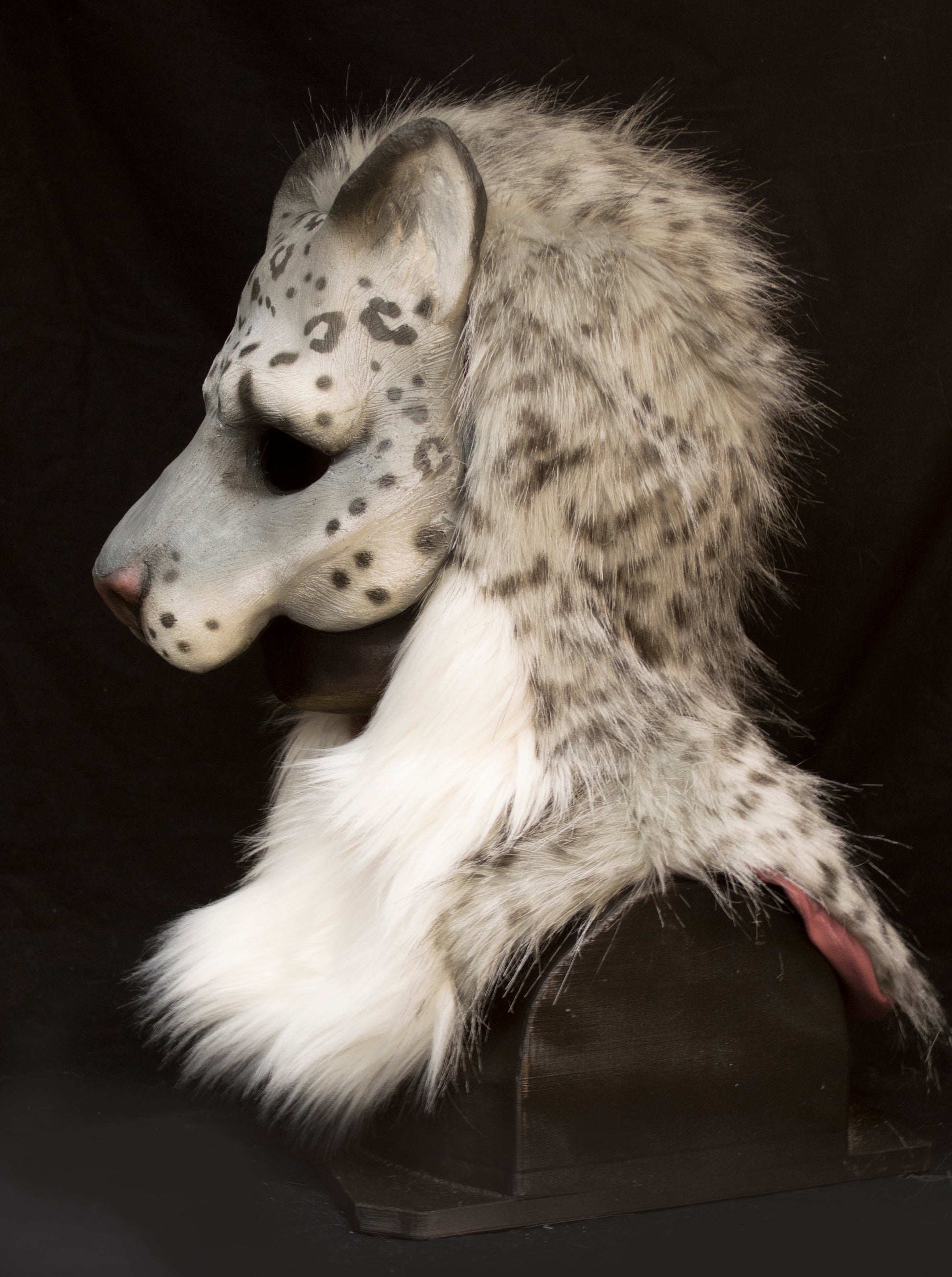 Snow leopard hooded mask with tail for LARP, performance and costuming