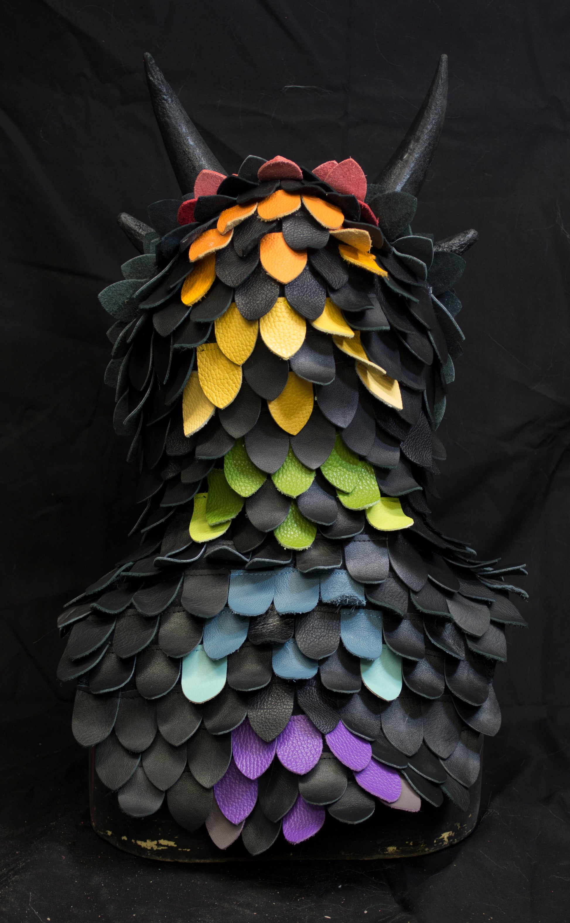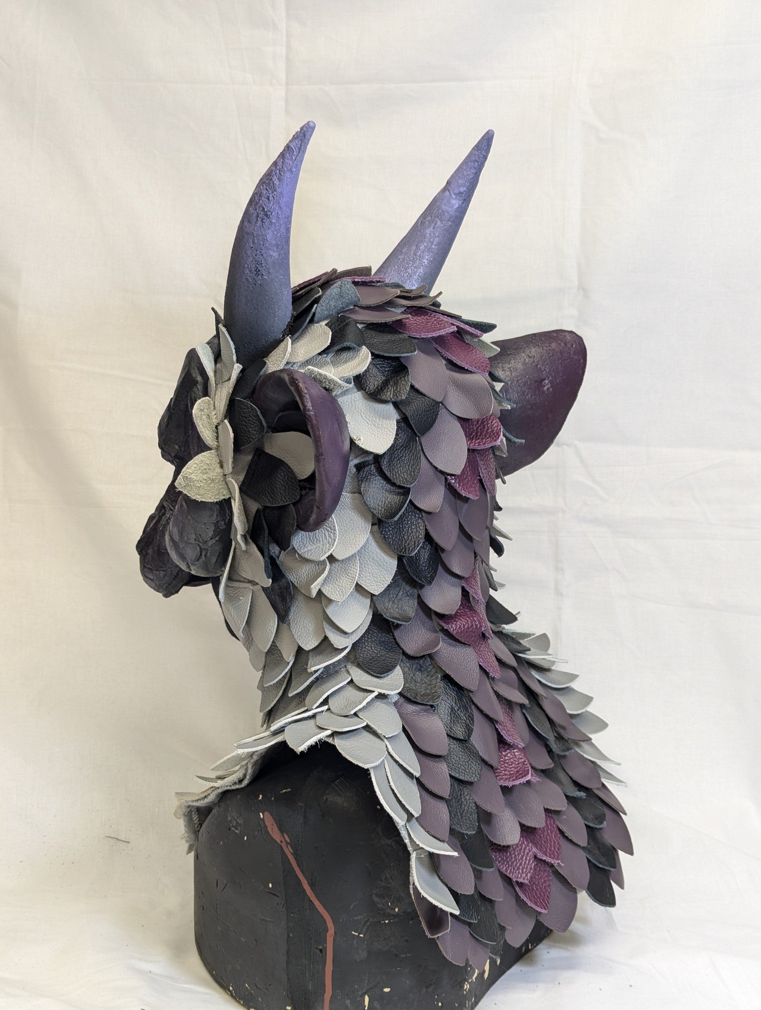 Faux Leather scaled hood: I cut individual scales from leather scraps in your chosen colour. As each scale is attached individually, I can create lots of unique patterns (The shades will vary depending on the availability of the material). Metallic effect material is also available sometimes, which would be really fun for a gold dragon or something equally brashy.